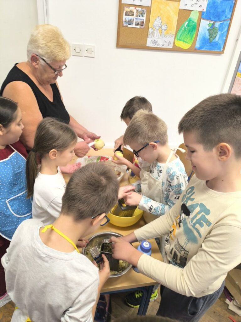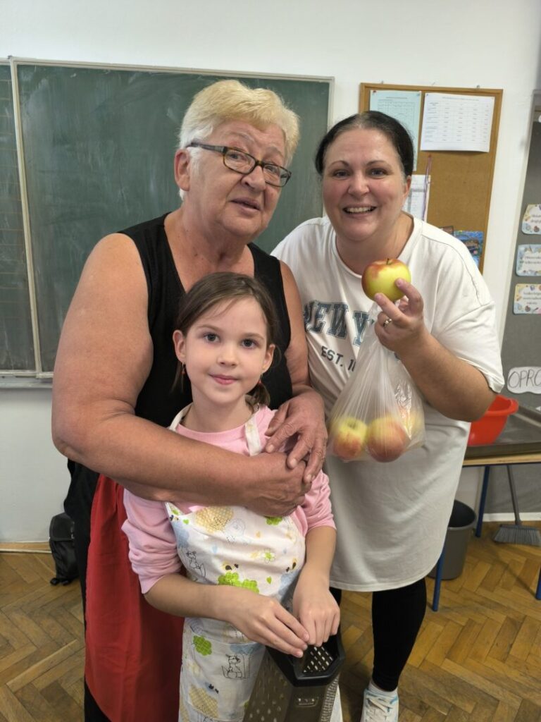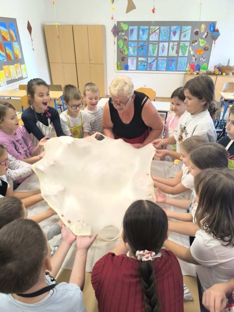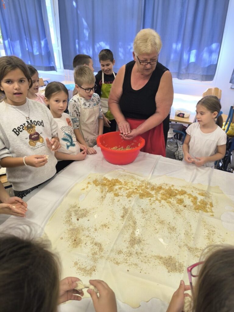 Poseban ugođaj donijele su nam gošće – baka i mama naše učenice Lane Golubović. Zajedno s njima učili smo kako se pripremaju domaće štrudle od jabuka. Djeca su s velikim oduševljenjem gulila i ribala jabuke, te pomagala u razvlačenju tijesta, čime su se mnogi prvi put susreli s ovim starim, ali vrijednim kulinarskim vještinama.