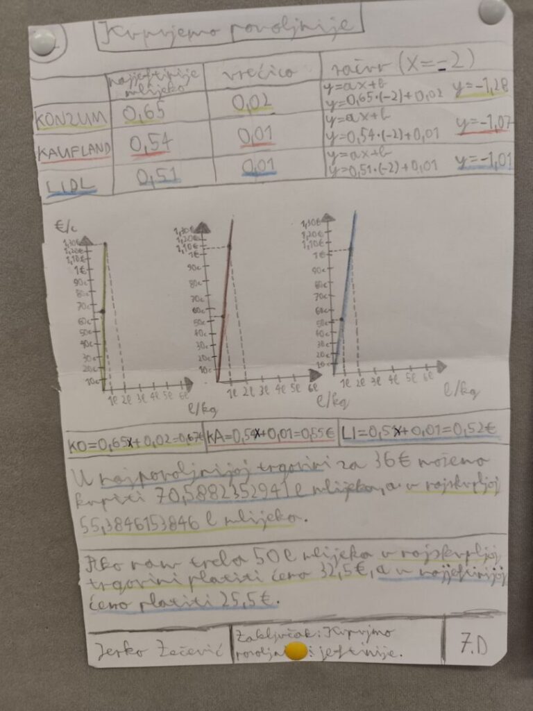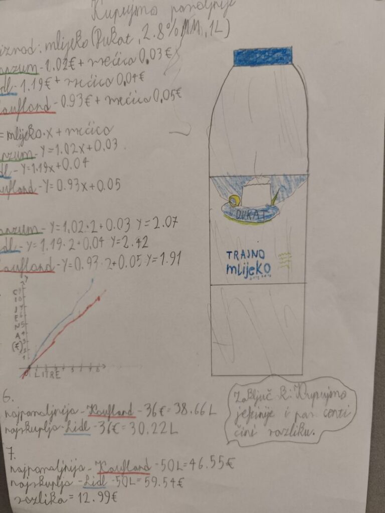 Učenici 7.b i 7.d razreda krenuli su  u istraživanje cijena te su uspoređivali cijene mlijeka, naranči, šećera i vrećica. Učenici su proučavali linearnu ovisnost potrošenog novca u odnosu na jediničnu cijenu proizvoda računski i grafički te trošak i uštedu na godišnjoj razini.
